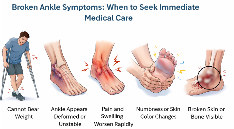 Certain broken ankle symptoms require urgent evaluation. You should seek immediate care if: